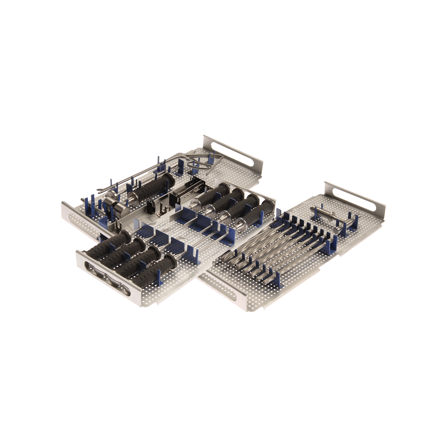 Femoral, tibial trays, patella components, custom & standard instruments.
